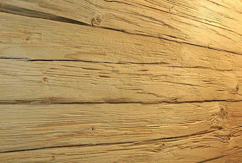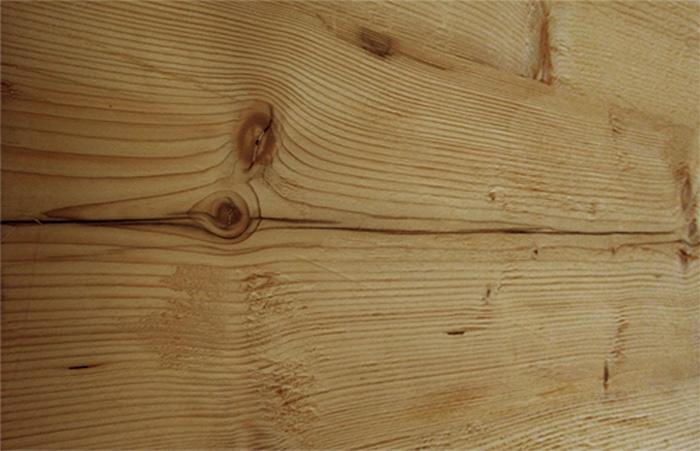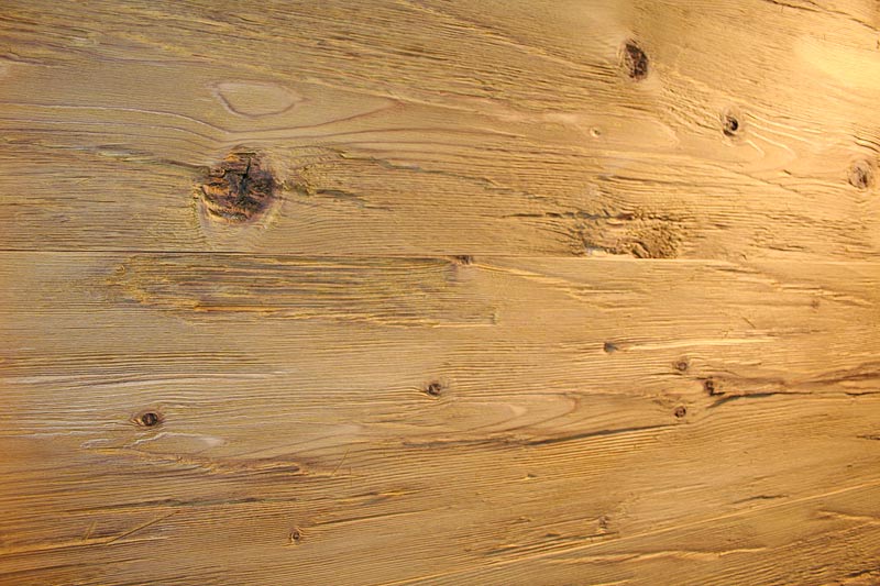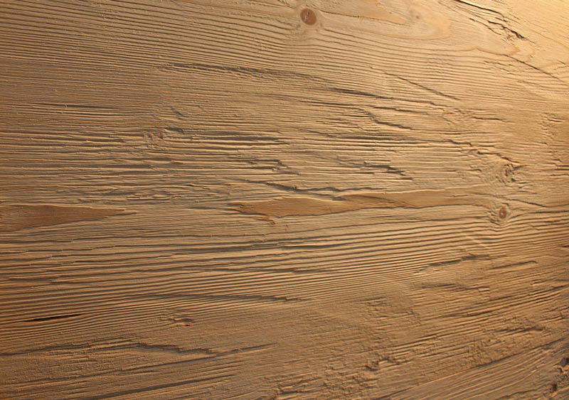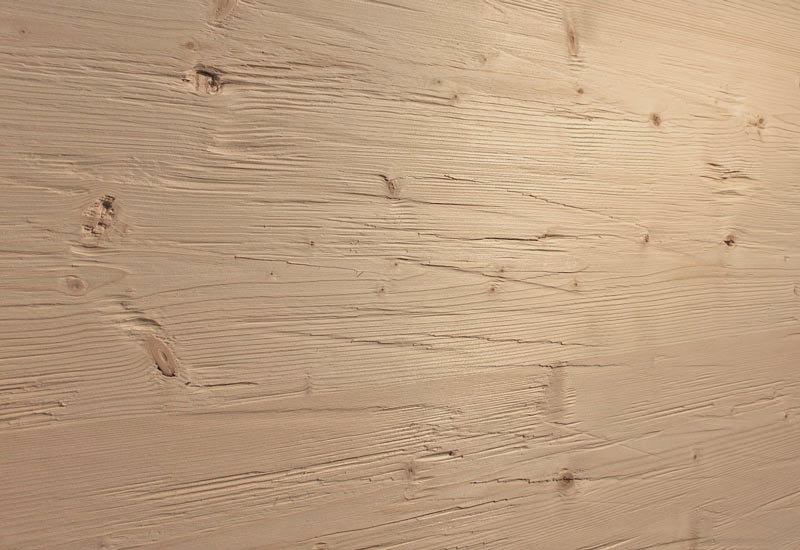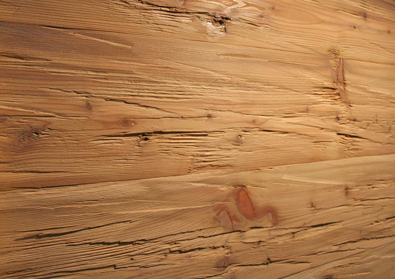 satter Braunton, (auch im Kernholz) durch die Therobehandlung werden unterschiedliche Bräunungen, Schwundrisse und Verwindungen von Altholz nachgebildet. Statisch nicht belastbar |